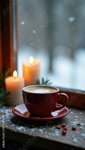 Coffee and tea on a snowy wooden table with candles lit, candle, peaceful, cup