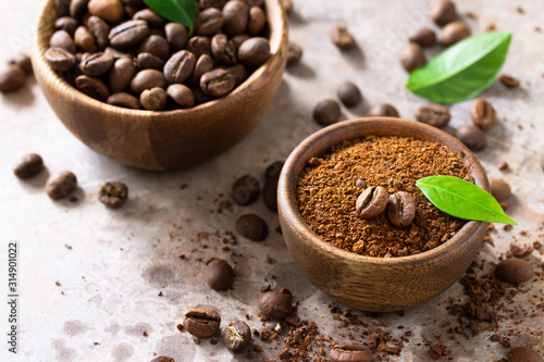 Coffee background. Coffee beans and ground powder on a stone concrete tabletop. Copy space.