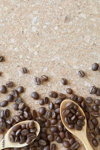 Coffee bean with two wooden coffee spoon on cork board with copy space. Flat lay, top down.