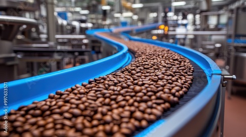 coffee beans on a conveyor belt in a modern factory dedicated to roasting and filtering.