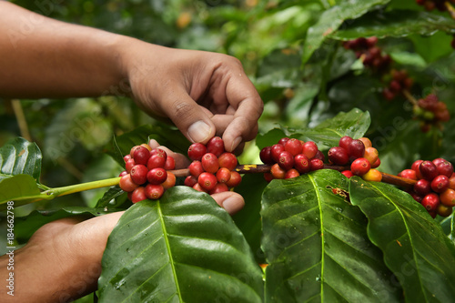Coffee beans ripening on a tree.