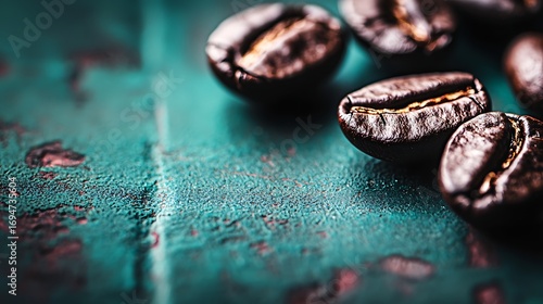 Coffee beans scattered on table in 4K, 50mm macro at f7.1, razor detail on central beans with gentle vignette and natural highlights