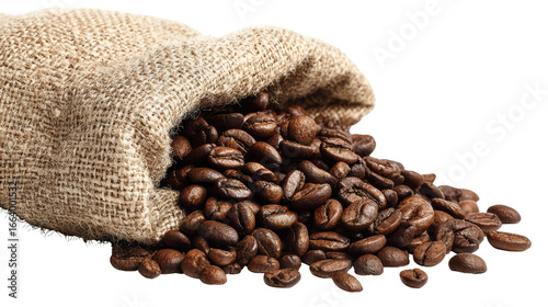 Coffee beans spilling from a burlap sack on a white isolated background.