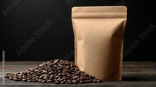 Coffee beans spilling from a mound next to a sealed kraft paper bag in a dark setting
