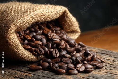 Coffee Beans Spilling from Sack on Rustic Table