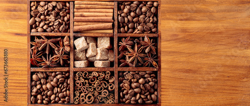 Coffee beans with spices and brown sugar.