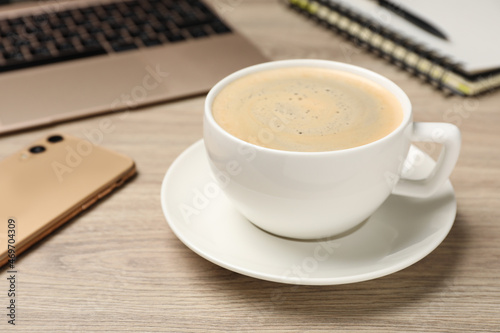 Coffee Break at workplace. Cup of hot drink on wooden table