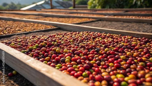 Coffee Culture Sustainable Fair Trade Concept, Coffee cherries drying on wooden racks in a sunny outdoor setting.