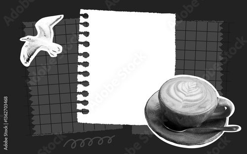 Coffee cup and seagull on black paper torn collage with grid and blank notebook page. Vector template of grunge morning journal page