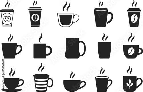 Coffee cup icons collection, hot drink silhouette vector set, tea mug symbols, steaming beverage graphic design, espresso latte cappuccino artwork for cafe branding