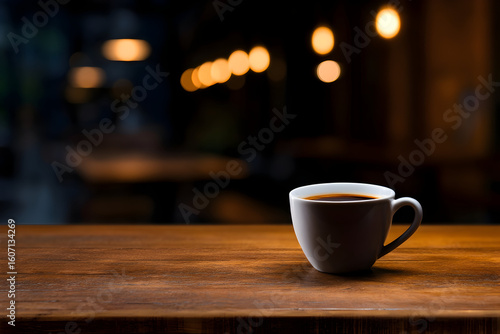 Coffee cup resting on a wooden table is illuminated by warm, soft lighting in a cozy cafe atmosphere filled with hanging lights in the background