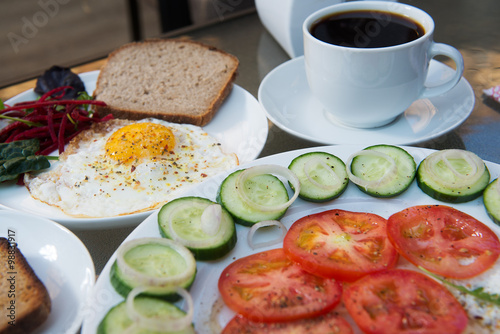 Coffee cup, scrambled eggs and salad breakfast on table