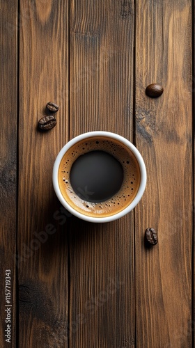 Coffee cup with brown liquid and coffee beans on wooden surface at cozy cafe