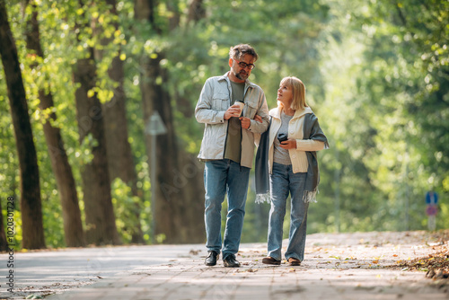 Coffee cups in hands, walking around. Senior couple together outdoors at nature