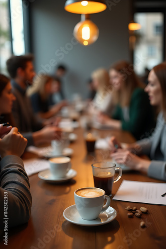 Coffee fuels imagination as creative minds gather around wooden tables brainstorming innovative ideas over steaming cups and lively conversation._00002_