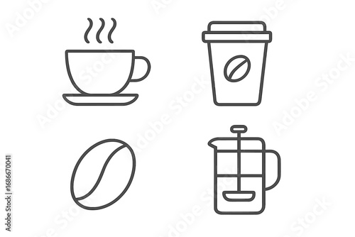 Coffee icon set vector line art. Collection of caffeine symbols for cafe menu. Hot drink, takeaway cup, coffee bean, french press. Simple outline illustration for web, app design.
