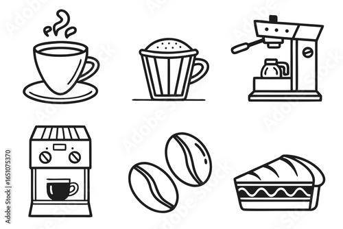Coffee icons cup, espresso machine, coffee beans, and cake slice isolated on white background