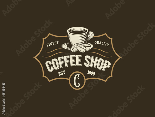 Coffee logo cup retro vintage vector illustration on dark background.