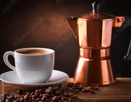 Coffee pot and coffee beans on a wooden table. Coffee background