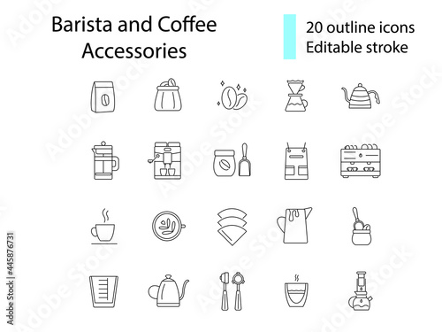 Coffee shop equipments outline icons set. Barista making appliance. Editable stroke. Isolated vector illustration