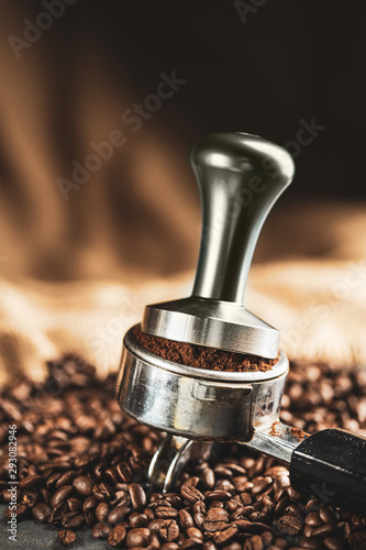 Coffee tamper,coffee press is made of stainless steel and roasted coffee beans from coffee roaster on black background,tool tamper