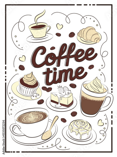 Coffee time vector illustration featuring coffee cups, croissant, cupcake, cheesecake, and cinnamon roll. Delightful pastries surround a central coffee theme with artistic flair.