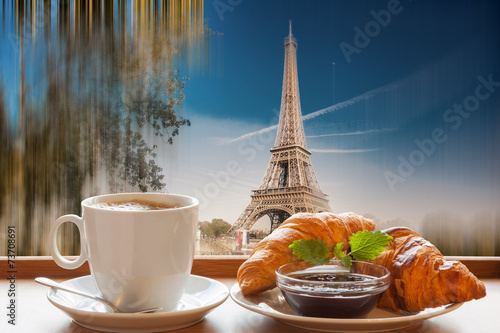 Coffee with croissants against Eiffel Tower in Paris, France