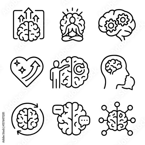 Cognitive Therapy Icons. Outline style icons of Cognitive Therapy: cognitive training brain, mindful therapy brain, brain with