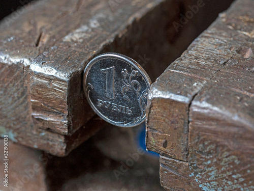 Coin one Russian ruble clamped by a metal vice on both sides. Concept of financial and business problems. The economy is in the grip