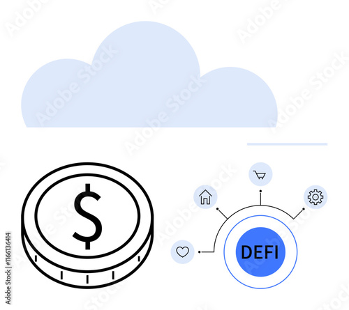 Coin with dollar sign, cloud illustration, and DEFI hub linked to icons for home, shopping, heart, and gear. Ideal for finance, blockchain, technology innovation decentralization investments