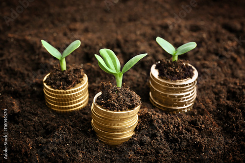 Coins in soil with young plant. Money growth concept.