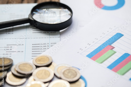 coins on bank account passbook and business chart
