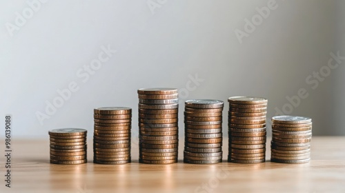 Coins stacked in a row on a wooden table, showing growth and savings.