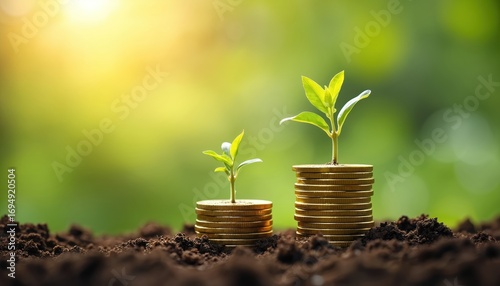 Coins stacked, sprouting green plants. Represents financial growth, investment, eco-friendly business. Shows money, nature harmony, sustainable economy development. Represents success, innovation.