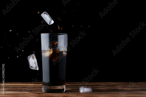 cola splash in glass with ice. glass cola with falling ince cube on dark wooden table and black background. isolated spalsh with ice piece