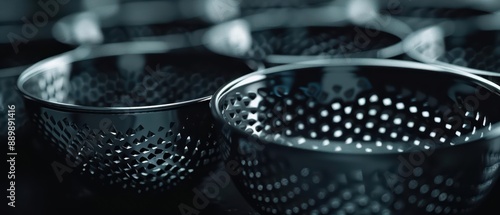 Colanders are depicted in ultramodern, supernatural scenes, with copy space, showcasing sleek designs and advanced materials for efficient draining and rinsing