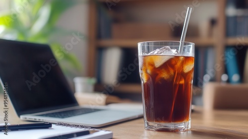 Cold Brew Coffee with Metal Straw on a Modern Office Desk with Laptop and Notebooks - Refreshing Workday Scene. AI generated illustration