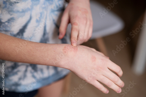 Cold dermatitis on a child's arm. How to treat peeling on your hands during the cold season. Close-up.