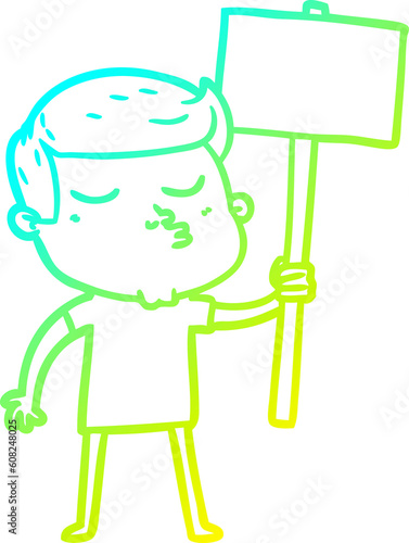 cold gradient line drawing of a cartoon model guy pouting with sign