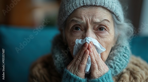 Cold. Portrait of a sad old woman, runny nose. An elderly woman has the flu and sneezes from a seasonal viral problem. Fever and cold in elderly with flu