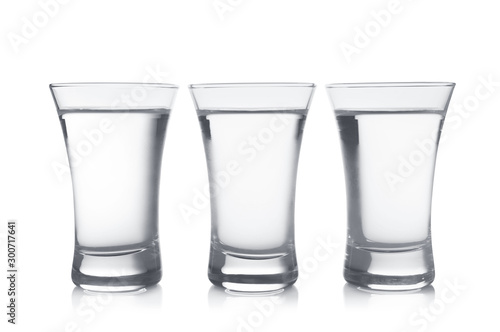 Cold vodka in shot glasses on white background