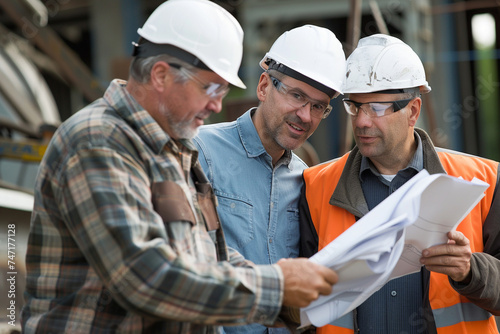 collaboration and leadership of a foreman, industry project manager, and engineer, gathered around plans and blueprints, symbolizing efficiency and expertise in the workplace, phot