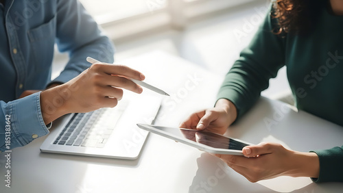Collaborative Business Meeting, Professionals Engaging, Office Space, Photography, Bright Environment, Close-Up View, Teamwork Concept