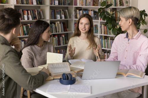 Collaborative learning. Confident young high school girl student speak on group study session in campus library share idea with diverse groupmates engage peers in active discussion for problem solving