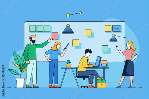 Collaborative office workspace, team working on project, plants and bookshelf, modern work environment, vector illustration of teamwork task, organized desk setup, career cooperation