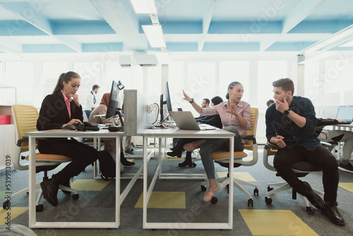 Collaborative process of multicultural skilled young business team during brainstorming meeting in office.Diverse group of young people dressed in formal wear cooperating on developing design project