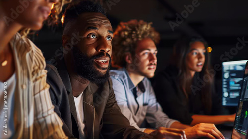 Collaborative team working on technology projects in dimly lit environment, showcasing focus and engagement. atmosphere is dynamic and innovative, highlighting teamwork and creativity