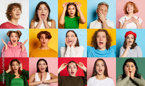 Collage made of many different people. Men and women posing with diverse emotions over multicolored studio background. Concept of human emotions, facial expression, youth, lifestyle.