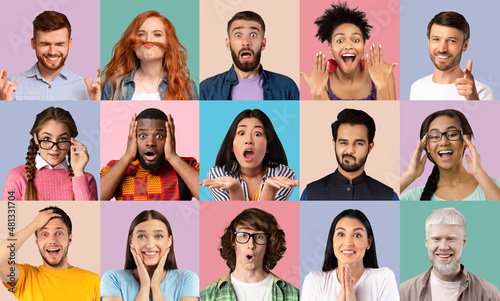 Collage of diverse people expressing different emotions on colorful backgrounds