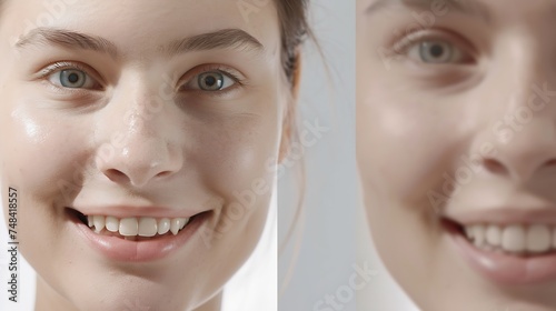 Collage with photos of woman with diastema between upper front teeth before and after treatment on white background closeup Banner design : Generative AI